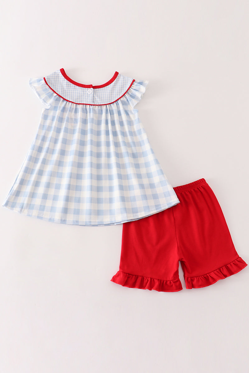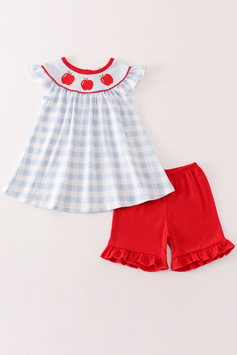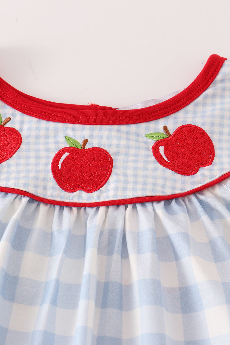 Blue apple embroidery plaid girl set