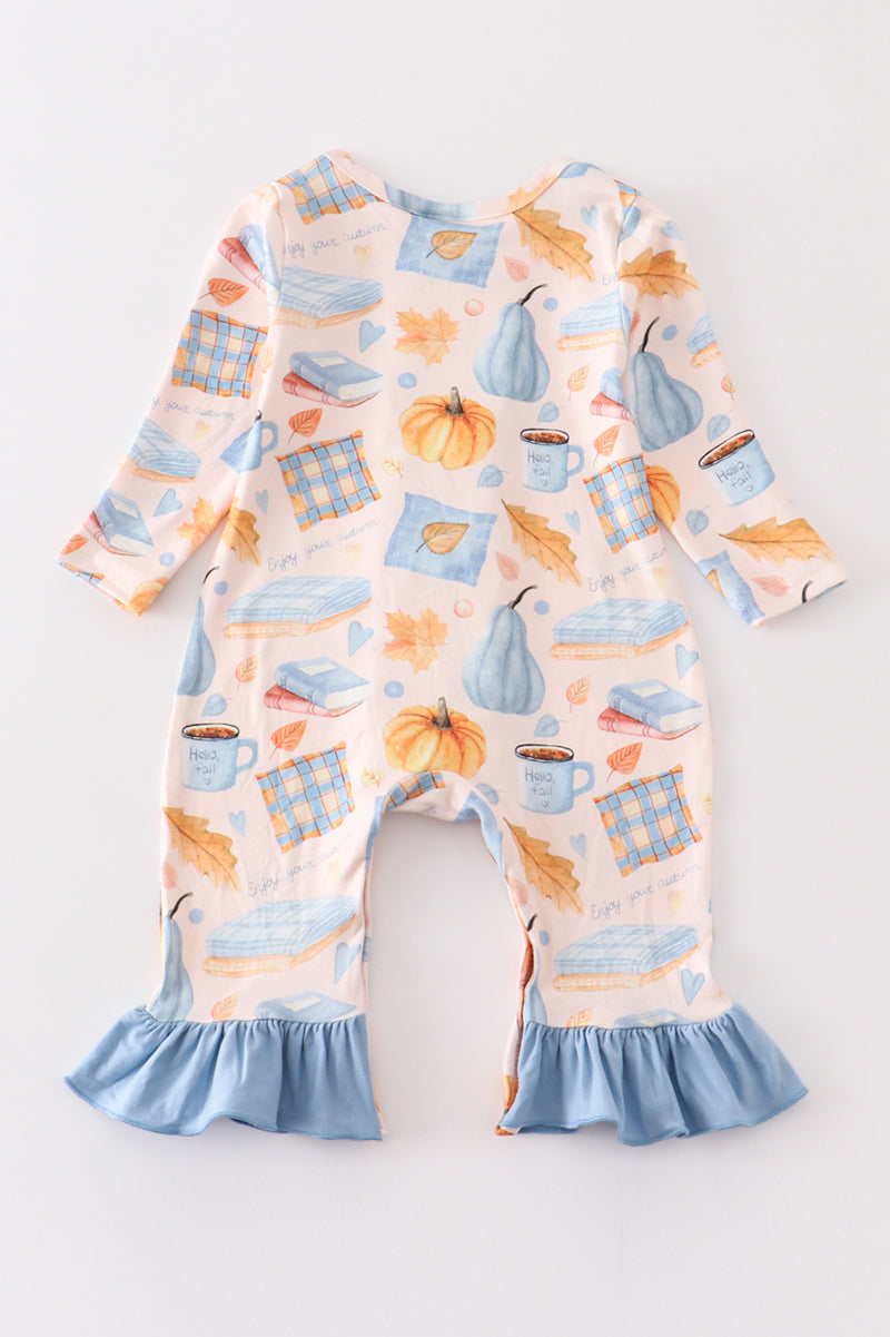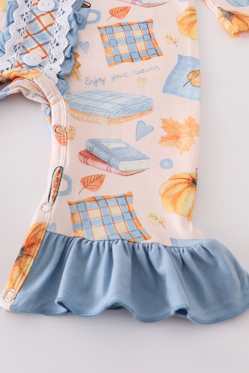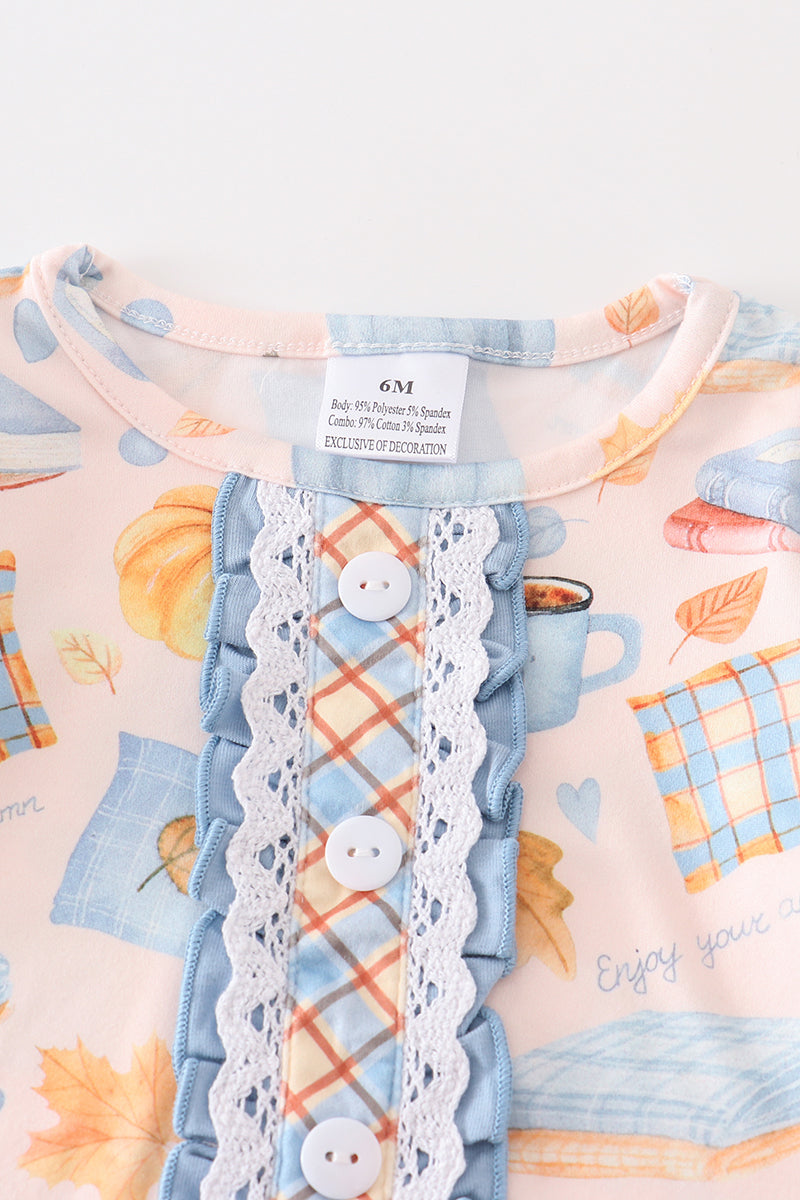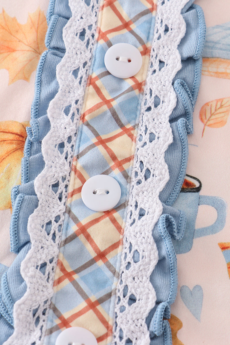 Your baby will be lookin' spooky-cute this autumn season in this Blue Plaid Pumpkin Print Ruffle Baby Romper! Adorned with a traditional plaid pattern and a playful pumpkin print, this romper is sure to get 'em plenty of double-takes and compliments. Put a spell on your baby's wardrobe with this one-of-a-kind ruffled romper!