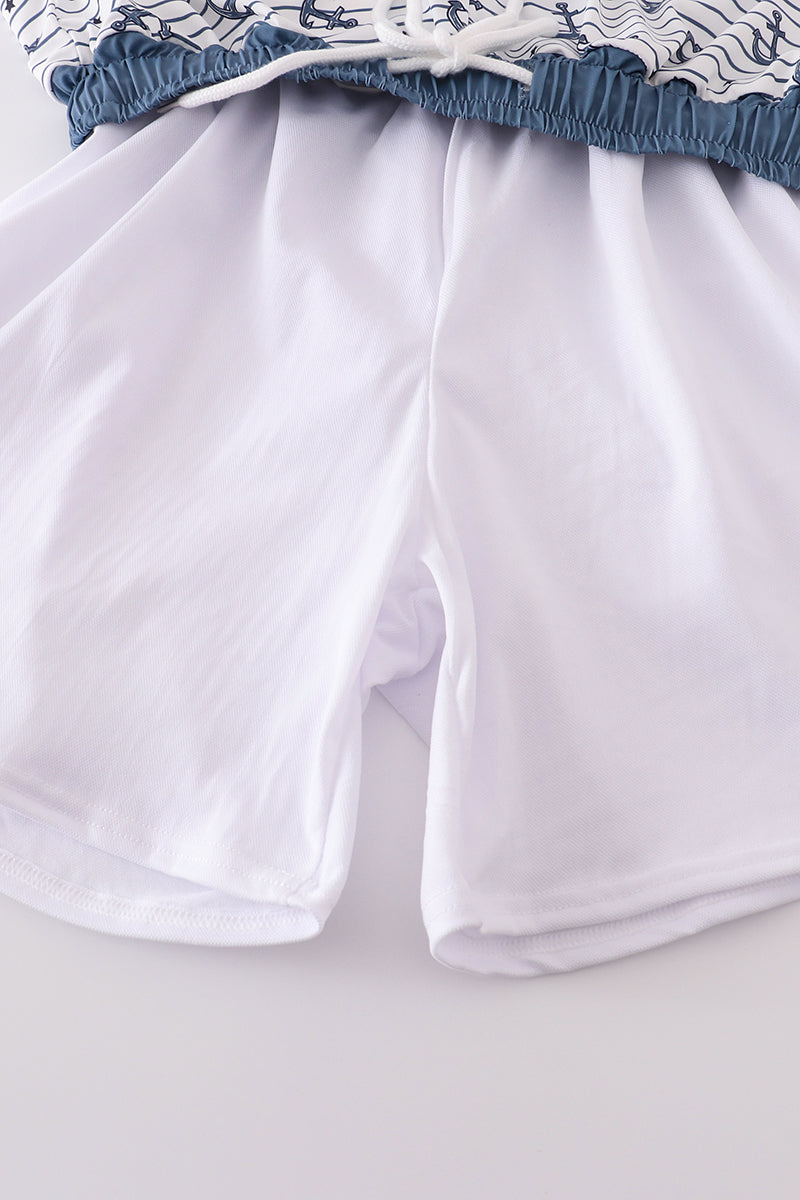 Get ready to make a splash with these blue stripe anchor print dad swim trunks! These stylish swim shorts are perfect for any beach day or pool party. With a fun nautical design, you'll be the coolest dad around. Don't forget the sunscreen and your favorite dad jokes!